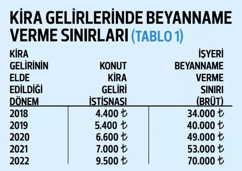 2018 için 37.600 lira, 2019 için 39.840 lira, 2020 için 42.320 lira, 2021 için 44.960 lira, 2022 için 80.000 lira ödendiğinde, geçmiş beş yılın vergisi sorulmayacak. İlgili yıllarda kira gelirinden dolayı beyanname verme sınırını aşmayanlar için zaten vergi riski olmadığını da belirtelim. “Hangi yıl için en az ne kadar kira geliri elde edildiğinde beyanname verme, vergi ödeme zorunluluğu bulunmuyordu?” sorusunun cevabı da aşağıdaki tablodan görülebilir. (Tablo 1)
