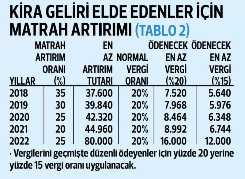 Geçmiş beş yılın hangisi için ne kadar ödeme yapılması gerektiği tabloda görülebilir. Örneğin; 2020 yılı için vergi incelemesi riskinden kurtulmak isteyenler, daha önce beyan ettikleri GV matrahını, yüzde 25 oranında arttıracak (arttırılan matrah 42.320 TL’nin altında olamıyor), bunun da yüzde 15’ini ödeyecekler.