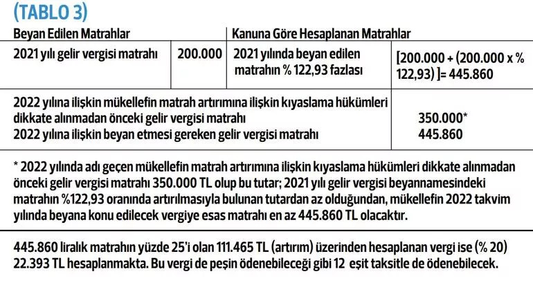 2022 kira gelirlerinin beyan dönemi (31 Mart 2023) henüz sona ermemişken vergi barışı yasalaştığından, 2022 için matrah artırımında bulunacaklar için ilave kriterler getirildi. 7440 sayılı yasanın uygulanmasına yönelik 1 no.lu tebliğde 2022 için matrah artırımı kriterleri örnekle açıklanıyor. 2021’de 200 bin lira, 2022 de 350 bin lira gelir (gayrimenkul sermaye iradı) elde eden mükellef örneği üzerinden kıyaslama sonrası beyan edilmesi gereken matrah artırım tutarı aşağıdaki tabloda açıklanıyor. (Tablo 3)